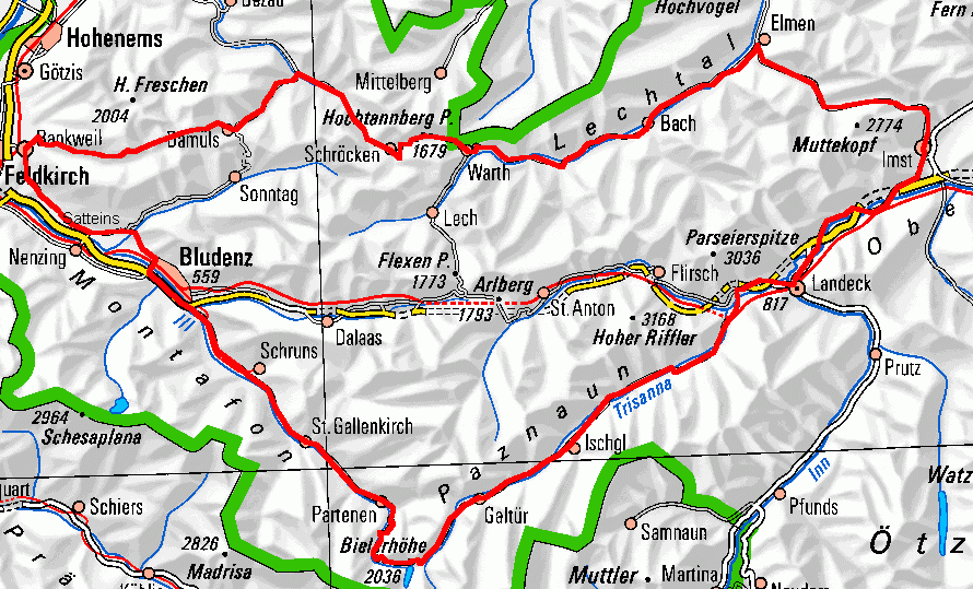 | Anreise | Die Runde kann selbstverständlich auch ab Rankweil, Bludenz oder Feldkirch gefahren werden. Ab Zürich mit Schnellzügen bis Feldkirch. Reisezeit ab Zürich knapp 2h. Veloverlad für 1 Tag Fr. 15.-, resp. Fr. 10.- mit Halbtax.. |