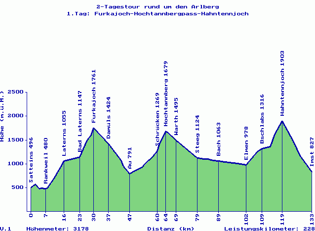 Diese Tour bietet den ersten, anspruchsvolleren Teil einer 2-Tagestour rund um den Arlberg (s. "Rund um den Arlberg 2"). Dabei sind drei nicht allzu hohe aber knackige Pässe zu fahren. Von Satteins aus startet die Runde über einen kleinen "Hupferl" nach Rankweil. Ab da zieht sich die Strasse über 9 Kilometer in einer mittleren Steigung Richtung Laterns und führt durch zwei längere Tunnels. Die nächsten 7 Kilometer bis Bad Laterns sind flach. Aber dann geht's los. Über 600 Höhenmeter sind mit einer durchschnittlichen Steigung von 9.5% zu bewältigen, die letzten beiden Kilometer bis 16%. Das Furkajoch ist ein kleiner Nebenpass mit angenehm wenig Verkehr. Die Abfahrt führt bis Au, von wo die Hauptstrasse auf die nächste Anhöhe führt.